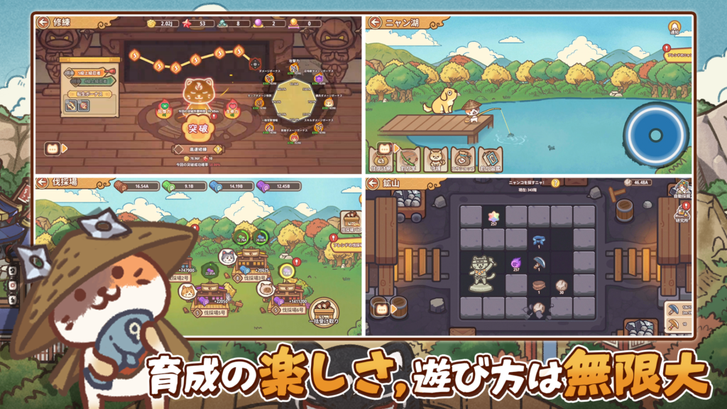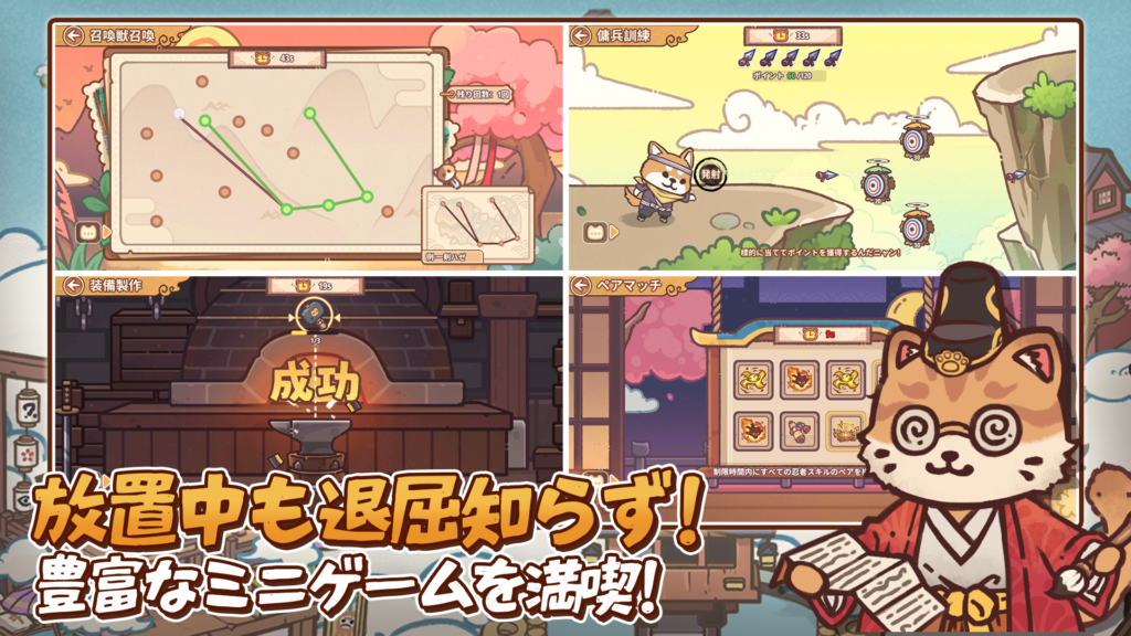 また、放置報酬システムにより、プレイ時間が限られているユーザーでも着実に成長できる点も大きな魅力です。忙しい日常の中で、ログインするたびに成長した猫忍者たちに出会える喜びは、本作ならではの体験と言えるでしょう。