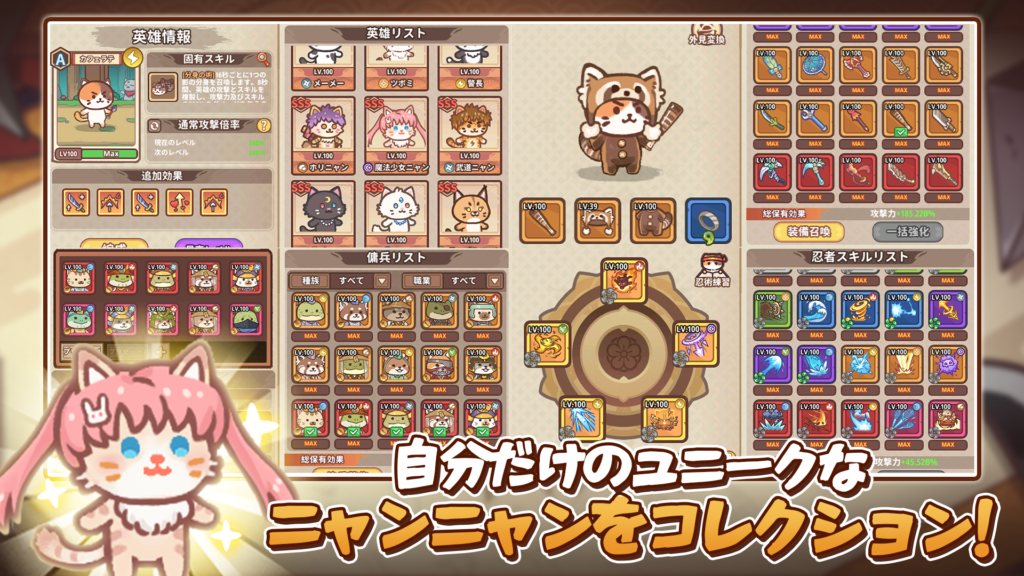 放置報酬をこまめに受け取り、忍者猫たちのレベルを上げ、最強の猫忍者を目指しましょう。